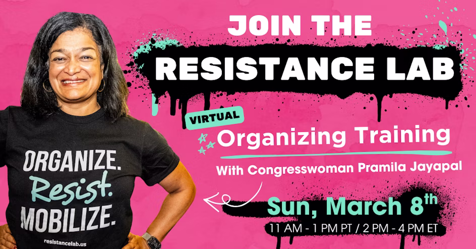 We won’t just talk about fear or frustration, we will turn it into collective, organized action. Join the thousands of participants who have learned directly from Pramila as she shares vital non-violent resistance tactics to anyone looking for ways to stand up to authoritarianism and turn their anger into action. https://www.pramilaforcongress.com/the-resistance-lab